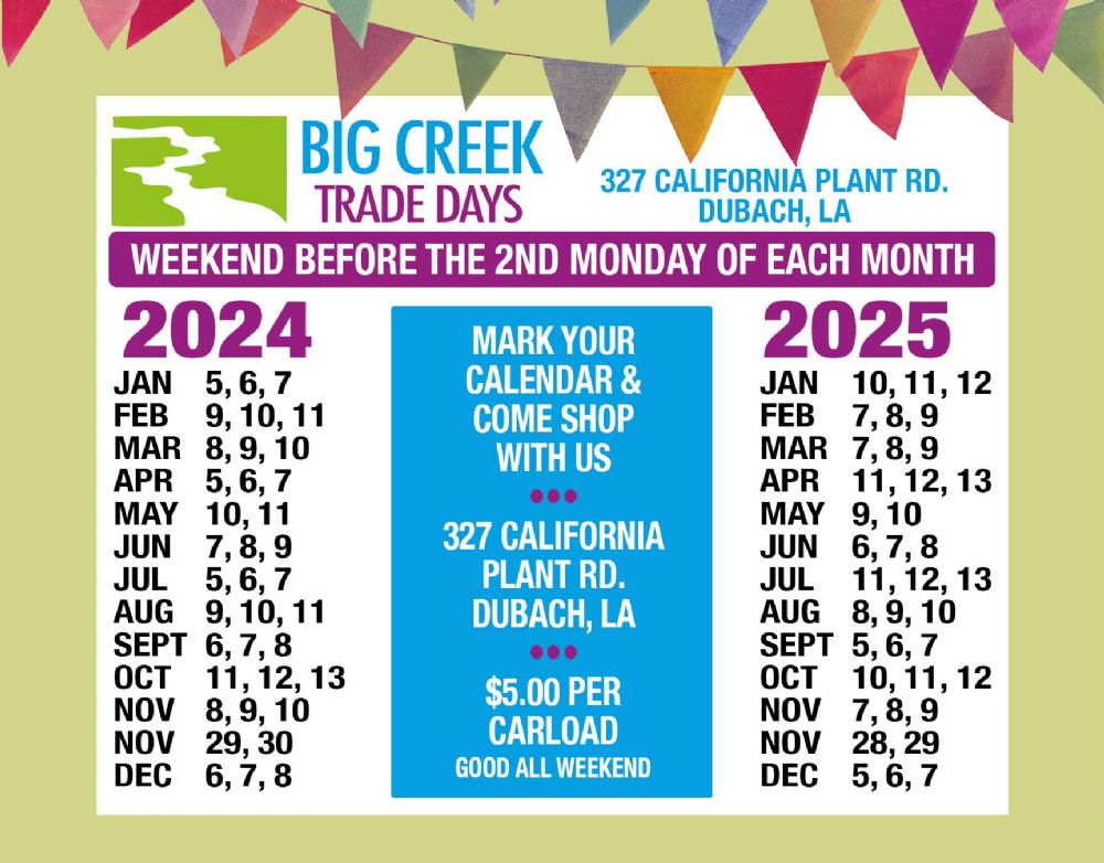 Website BigCreekTradeDays.com Location Big Creek Trade Days 327 Californai Plant Rd Dubach, LA 71235 Contact Name: Rosie Colvin Phone: 318-680-1304 Web site: BigCreekTradeDays.com ![]() North Louisiana's largest indoor trade days. Shop, Eat, Enjoy! $5.00 per carload good all weekend Get Directions using Google MapsSend Email to Event Contact978421A4-B5B9-4084-B67E-3C55E731D2D6